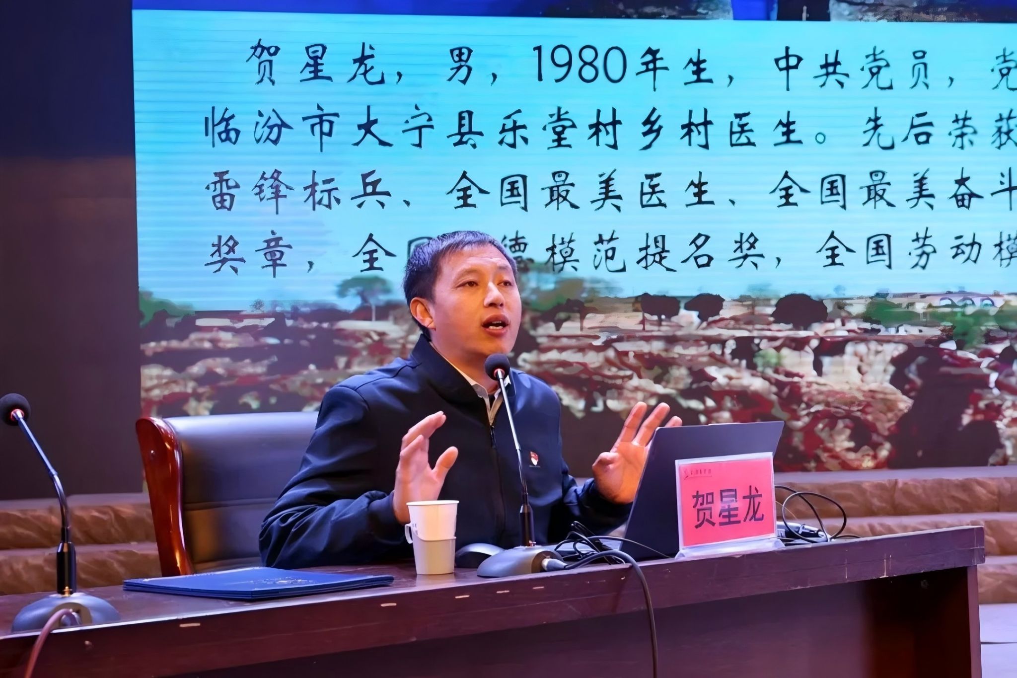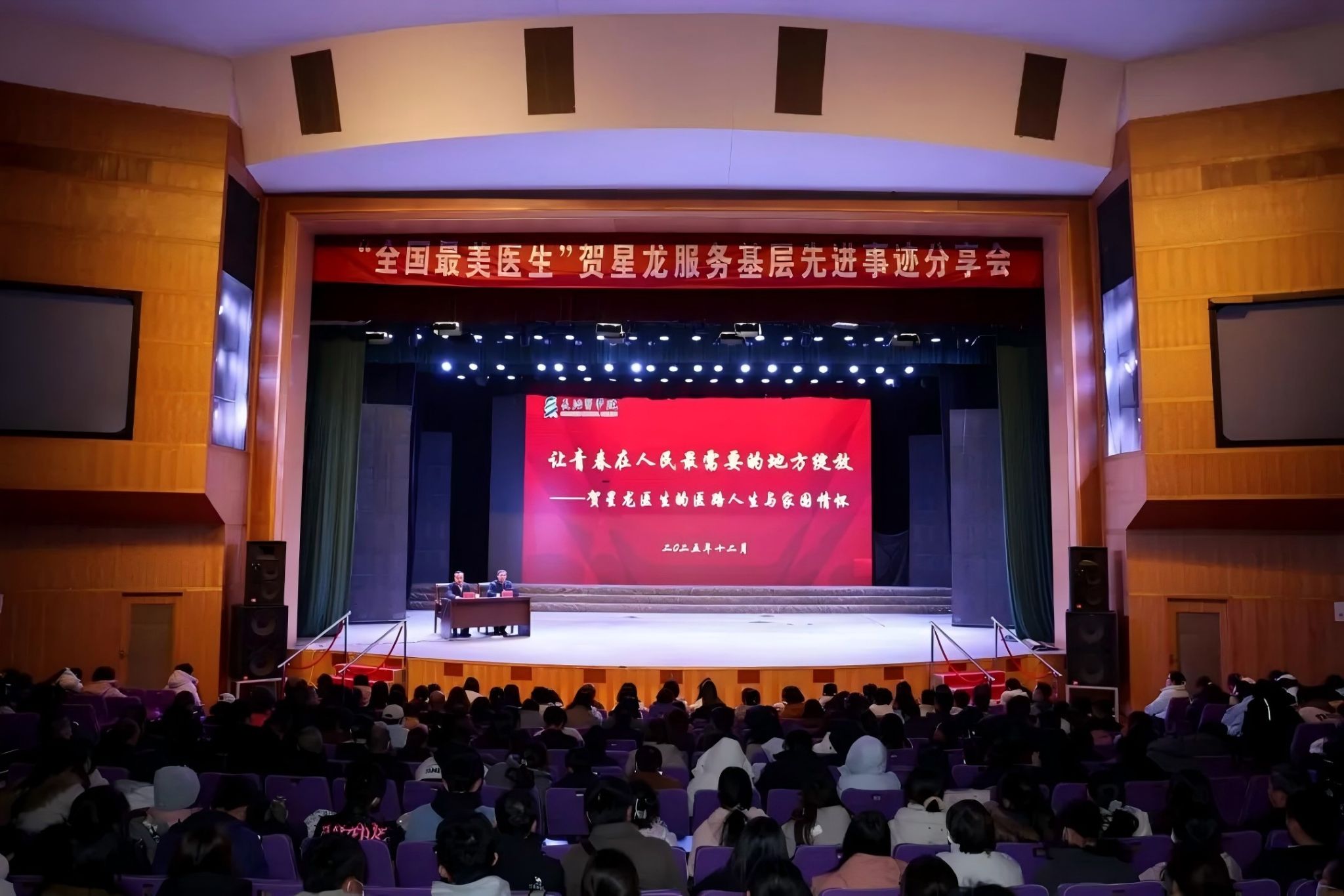为强化思政教育与医学职业价值引领,着力培养“仁心仁术、沾泥带土、贴心贴肺、经世致用”的高素质医学人才,12月1日下午,由继续教育学院与学生工作部联合举办的“白求恩奖章”获得者、全国“最美医生”贺星龙先进事迹分享会在科学会堂举行。思政教师,专兼职辅导员,“第一村医”医疗团队代表,免费医学定向生、学生党员,国奖、励志等奖学金获得者、班团干部和宿舍长代表,正在我校参加培训的乡村医生学员一同聆听,共同感悟初心使命。分享会由校党委副书记、校长王旭主持。