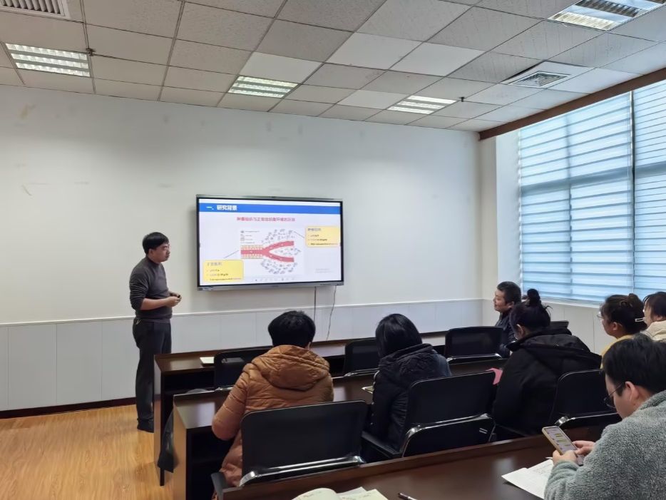 学术交流环节,药学院药物分析教研室卢玉超博士做了题为《多功能糖基超分子在抗肿瘤方面的应用研究》的学术报告,报告针对化疗在肿瘤治疗过程中存在靶向性差以及癌细胞产生耐药性等问题,提出了基于多功能糖基超分子构筑靶向-肿瘤微环境响应性的纳米共递送体系,以期为肿瘤治疗纳米递送系统提供可借鉴的途径。互动环节,卢玉超博士就提出的纳米共递送体系如何实现靶向性和对肿瘤微环境的响应性以及关于中药活性成分聚集体的相关研究与大家进行了探讨和交流。